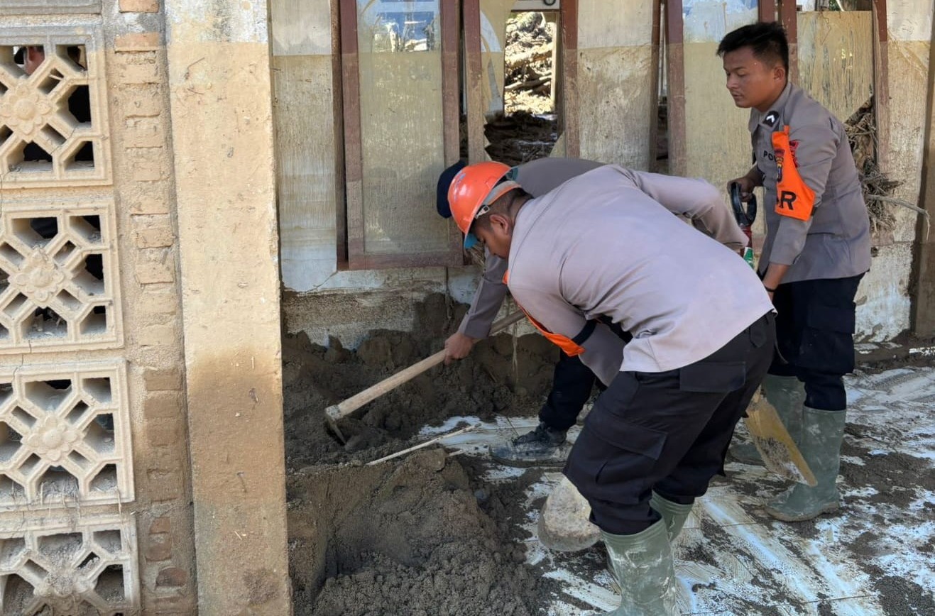 Personel Brimob turun ke lokasi-lokasi yang terendam lumpur, membantu membersihkan masjid dan rumah-rumah warga. Bukan sekadar kerja fisik—tetapi hadir untuk memulihkan harapan, menguatkan kebersamaan, dan memastikan tempat ibadah kembali layak digunakan.