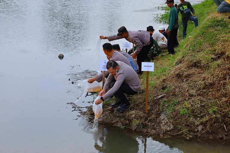 Jaga Ekosistem Sungai Polres Tulungagung Tebar 5.000 Benih Ikan Tombro di Boyolangu