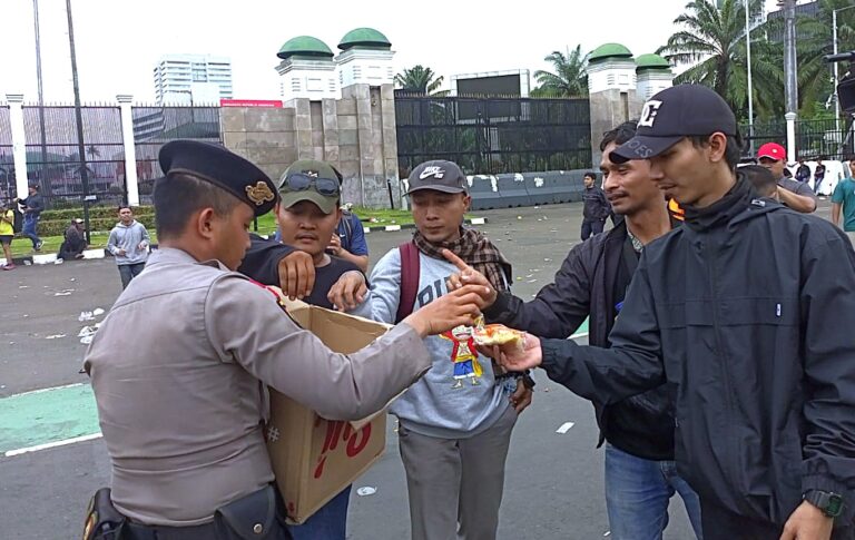 Aksi Simpatik, Polisi Bagikan Air Mineral dan Roti kepada Buruh di Depan DPR/MPR