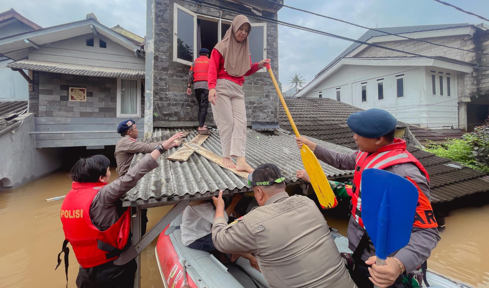 Kapolsek turut membantu warga tersebut menuruni atap lantai 1 menuju perahu karet. Sekeluarga itu kemudian dibawa ke pengungsian dengan menggunakan perahu karet.