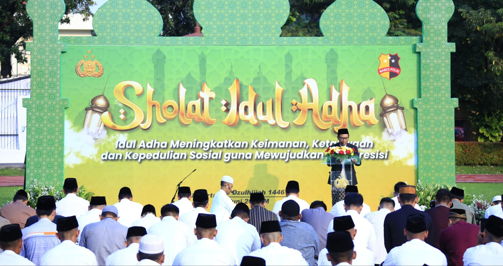 JAKARTA – Mabes Polri menggelar salat Idul Adha 1446 Hijriah di Lapangan Bhayangkara, Jakarta Selatan. Salat dipimpin oleh Ust. Muammar Samsudin yang merupakan Imam Masjid Baitul Hikmah Syurthah Mabes Polri dan Khatib Prof. Dr. Made Saihu M. Pd.