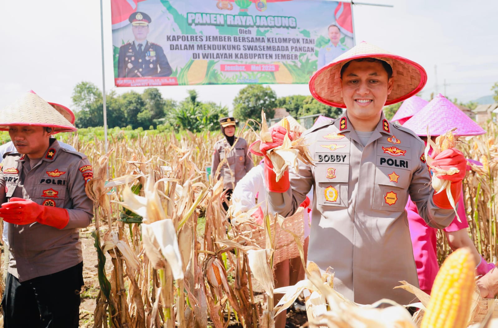 Hari itu, Kapolres Jember AKBP Bobby Adhimas Condro Putra turun langsung ke sawah untuk ikut panen raya jagung sekaligus menanam benih jagung baru bersama warga dan para pejabat terkait.