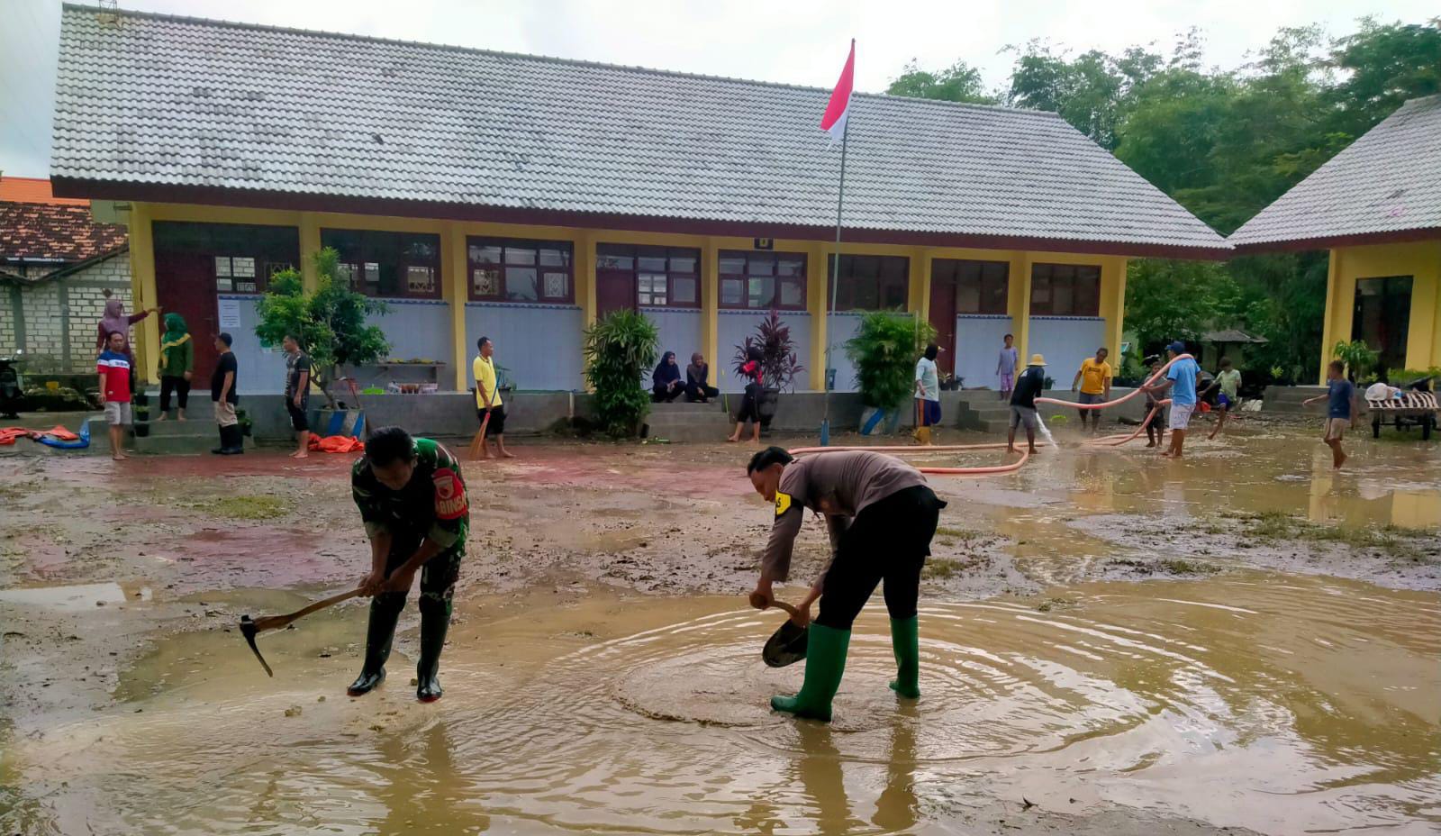 Mereka bersama-sama secara gotong royong melakukan pembersihan halaman sekolah yang digenangi air dan dan dipenuhi lumpur tebal.