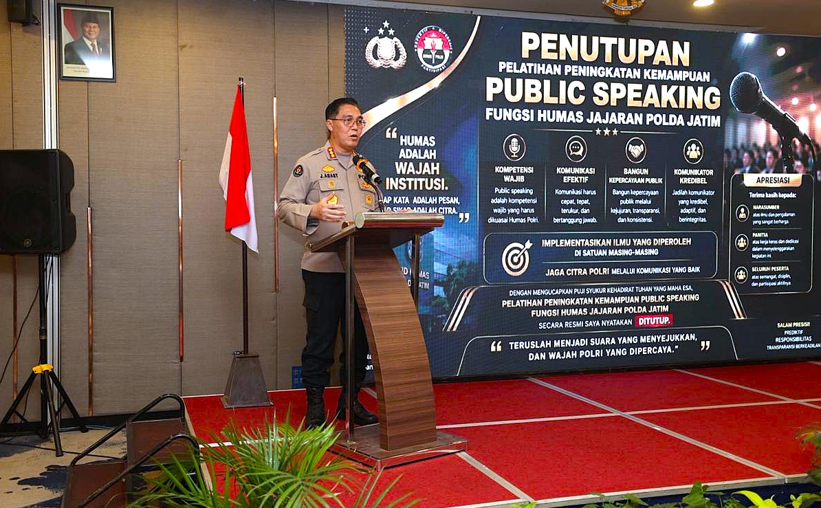 SIDOARJO – Kepala Bidang Hubungan Masyarakat (Kabid Humas)Polda Jawa Timur, Kombes Pol Jules Abraham Abast resmi menutup kegiatan Pelatihan Peningkatan Kemampuan Public Speaking Fungsi Humas Jajaran Polda Jatim Tahun Anggaran 2026 yang digelar di Sidoarjo, Rabu (29/4/2026).