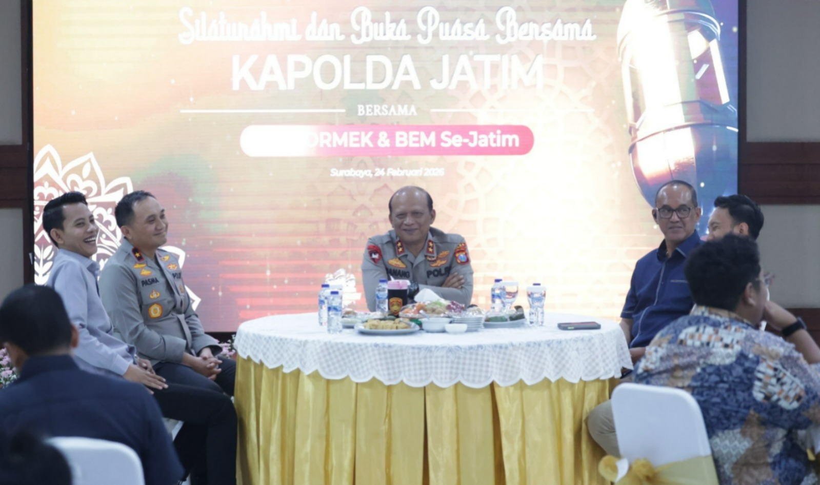 SURABAYA – Kapolda Jawa Timur, Irjen Pol Drs.Nanang Avianto, M.Si silaturahmi dan buka puasa bersama Badan Eksekutif Mahasiswa (BEM), Organisasi Mahasiswa Ekstra Kampus (Ormek) serta Organisasi Kemasyarakatan Pemuda (OKP) se-Jawa Timur di Selasar Gedung Patuh Mapolda Jatim, Selasa (23/2/2026).