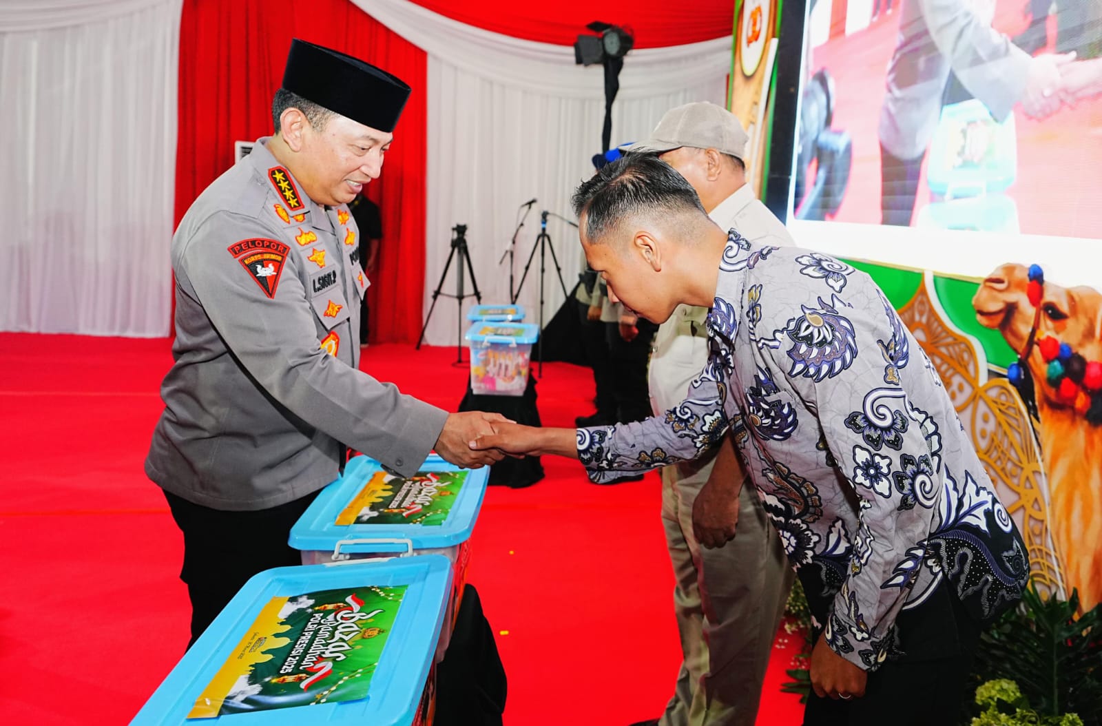 Jenderal Sigit juga menyambangi booth sembako dan menyerahkan paket sembako secara simbolis kepada perwakilan anggotanya. Empat perwakilan yang menerima paket sembako secara simbolis, yakni Bripda Surya Yuda Diorama (Ba Satbrimob Polda Jatim), Bharatu Relo Fambudi (Ba Ditpolairud Polda Jatim), Juru Rijan (PNS Yanma Polda Jatim) dan Abdul Kholiq (Remas Masjid Arif Nurul Huda Polda Jatim).