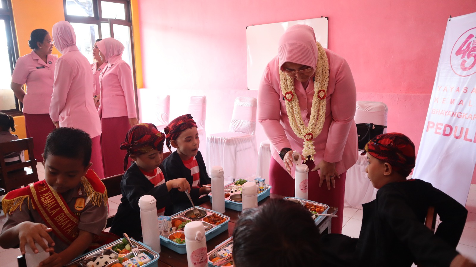 Istri dari Kapolda Jatim, Irjen Pol Imam Sugianto didampingi Ketua Bhayangkari Cabang Sumenep Ny. Agnes Henri mengecek langsung jalannya makan bergizi gratis yang diberikannya di ruang kelas TK Kemala Kemala Bhayangkari 81 Sumenep.