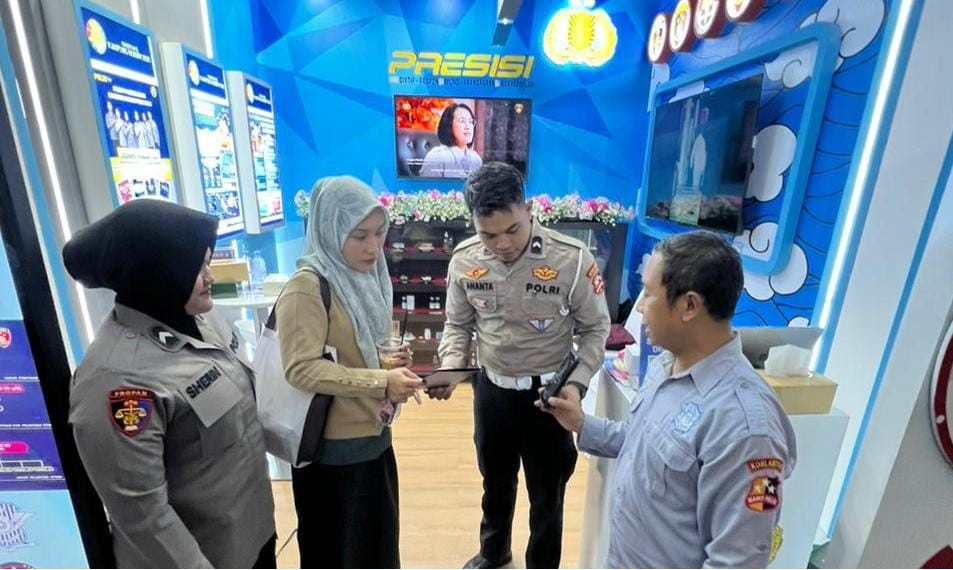 Melalui Booth Korlantas Polri, pengunjung memperoleh penjelasan langsung mengenai mekanisme kerja ETLE Mobile Handheld mulai dari proses identifikasi kendaraan, perekaman bukti pelanggaran, hingga pengiriman data secara real time ke sistem back office ETLE nasional.
