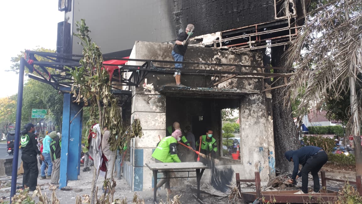 SURABAYA – Warga bersama driver ojol membersihkan pos polisi yang dibakar massa aksi pada Jumat (29/8/2025) dini hari.