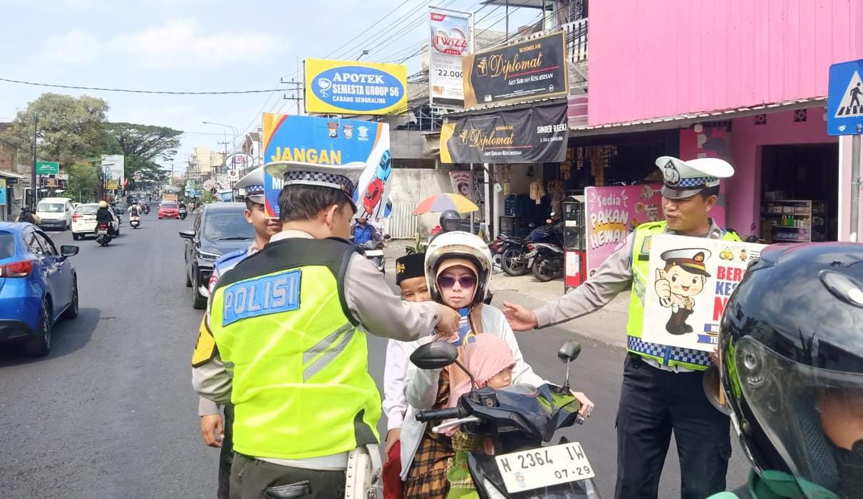 Kegiatan berlangsung secara simpatik, di mana pengendara yang melintas disambut dengan senyum oleh petugas sambil diberikan brosur keselamatan dan ajakan untuk tertib berlalu lintas.