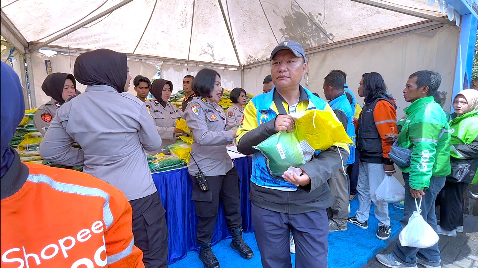 Pada kesempatan tersebut, Polresta Malang Kota Polda Jatim juga menyediakan 2.300 sak beras SPHP kemasan 5 kilogram atau setara dengan 11,5 ton beras disalurkan secara cuma-cuma kepada driver Ojol.